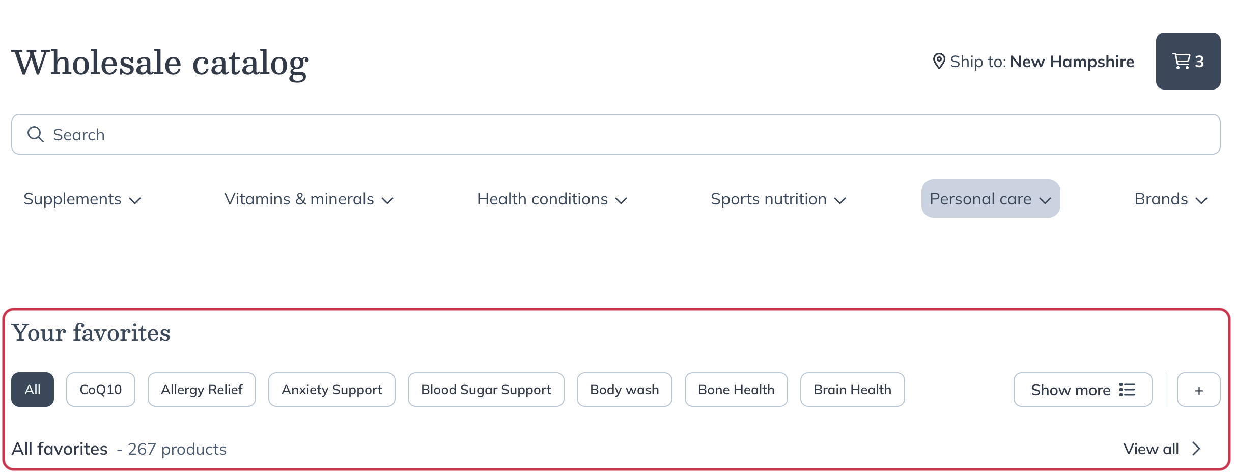 You can also add your favorited products to your wholesale cart. Find your favorites categories under the Your Favorites heading on your wholesale catalog page. Click on each category view the products in that category, and add them to your cart.