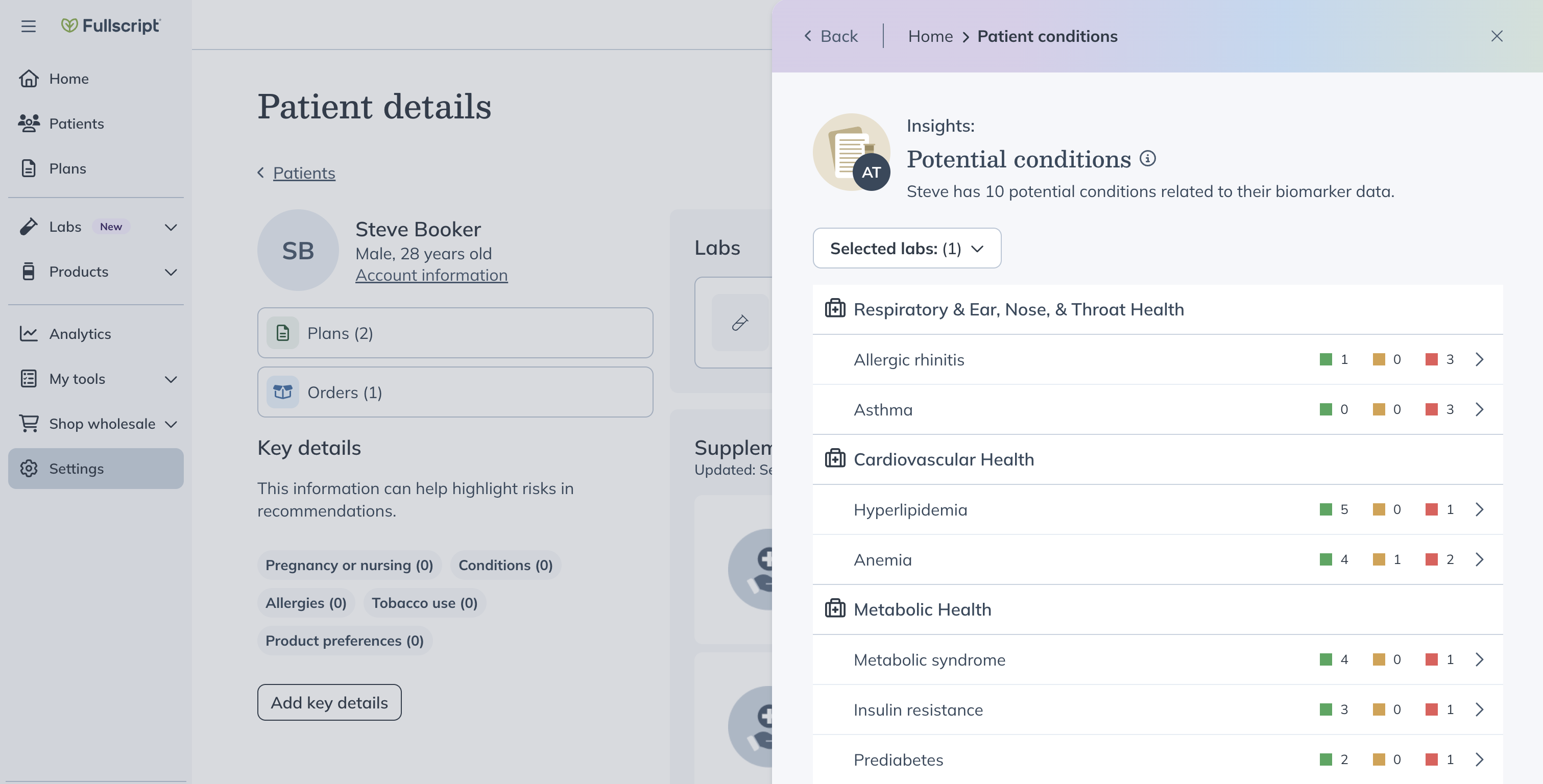Condition-based insights help you turn lab results or suspected conditions into clear, evidence-based insights within your plan-writing workflow. Bringing together biomarker interpretation, condition guidance, and supplement ingredients, it reduces reliance on fragmented resources or reference tools and saves time — without replacing clinical expertise.