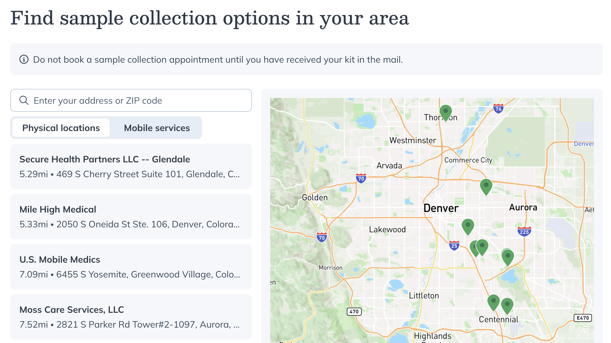 After entering their zip code, patients will see these options based on location and price to choose the most convenient one for them. These sample collection options appear directly in their Fullscript account as part of checkout.