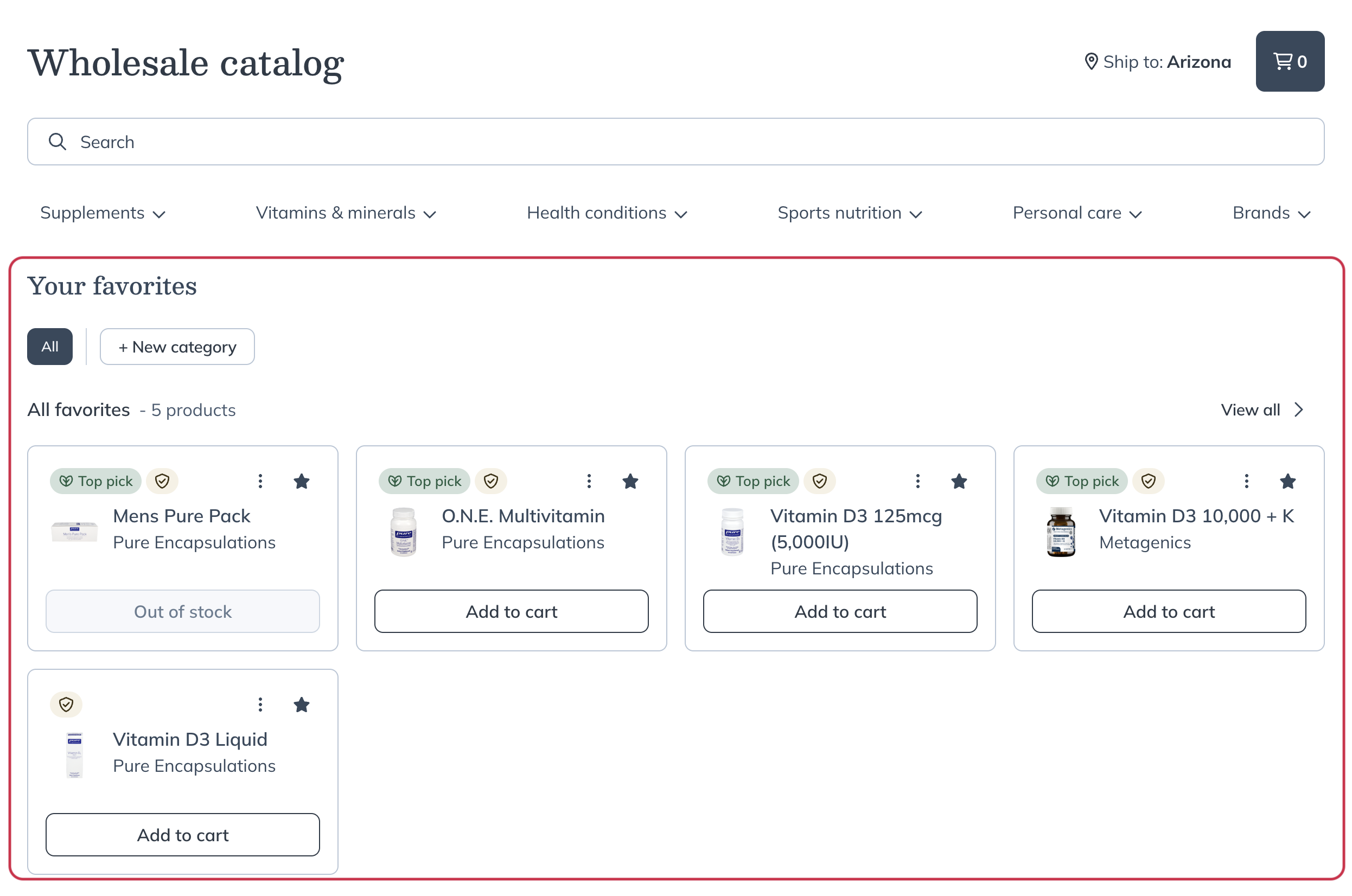 - View your items under Your favorites in the wholesale catalog. From here, you can create and edit favorites categories.