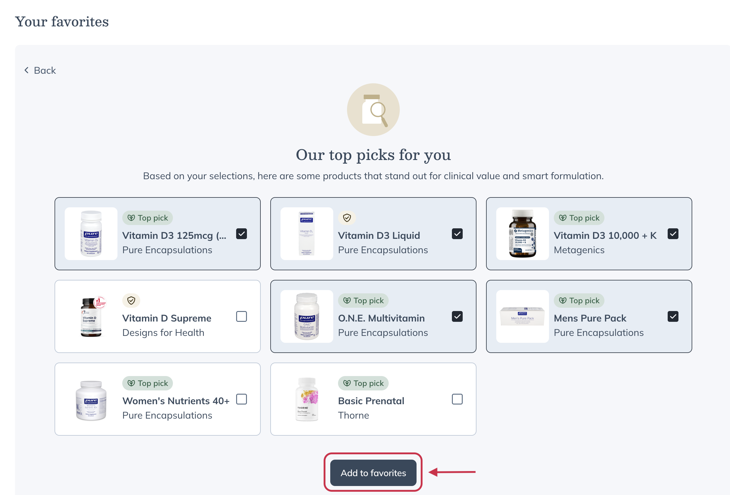 Quickly set up your favorites during onboarding. Choose curated categories, review recommended products, and add what you want—reducing decision fatigue and giving you a confident start.