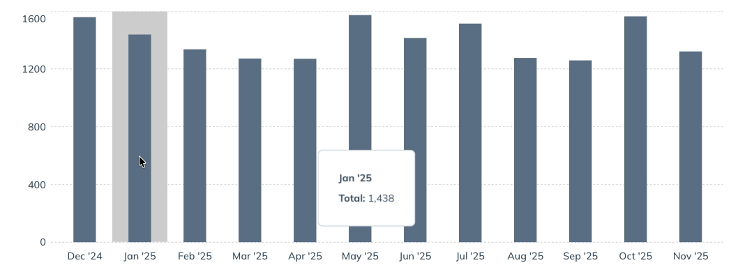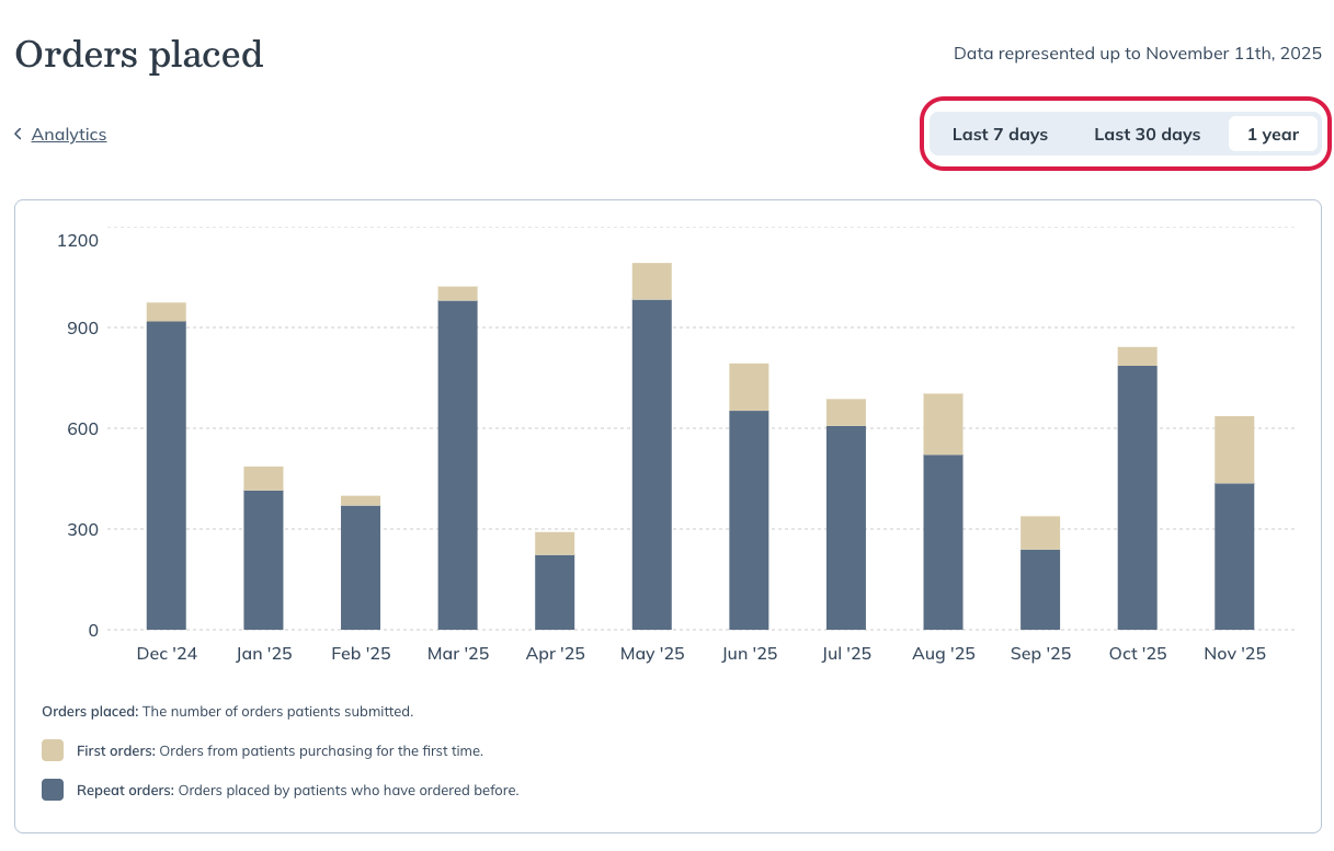 When expanded, this graph shows the number of orders placed by your patients over the last 7 days, 30 days and 12 months. Hover your cursor over a specific month to see a breakdown of first-time and repeat orders.