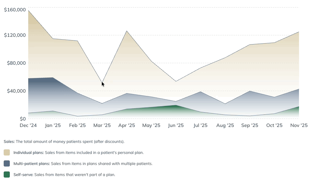 This chart shows your account’s total sales revenue – the price paid by patients for their orders after discounts, before taxes. Expand the sales graph to view monthly sales breakdowns, including revenue from individual plans, multi-patient plans, and self-serve through your store.