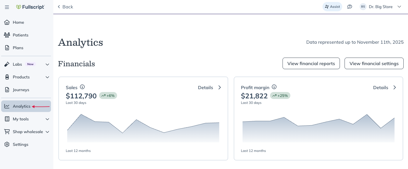 Fullscript’s analytics dashboard gives you powerful insights into your practice performance and patient behavior, helping you drive growth, optimize patient engagement, and make data-driven decisions with ease.