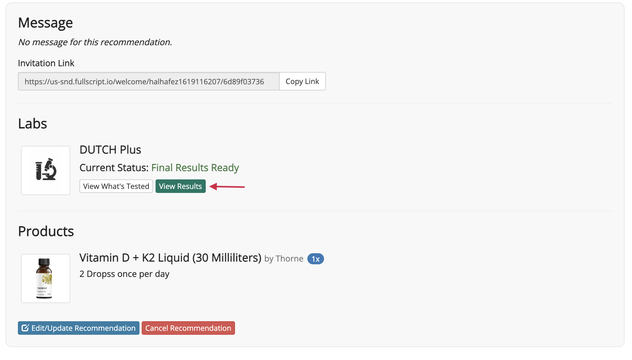 - Click Recommendations to view the client’s recommendation history, which includes both supplements and labs.
